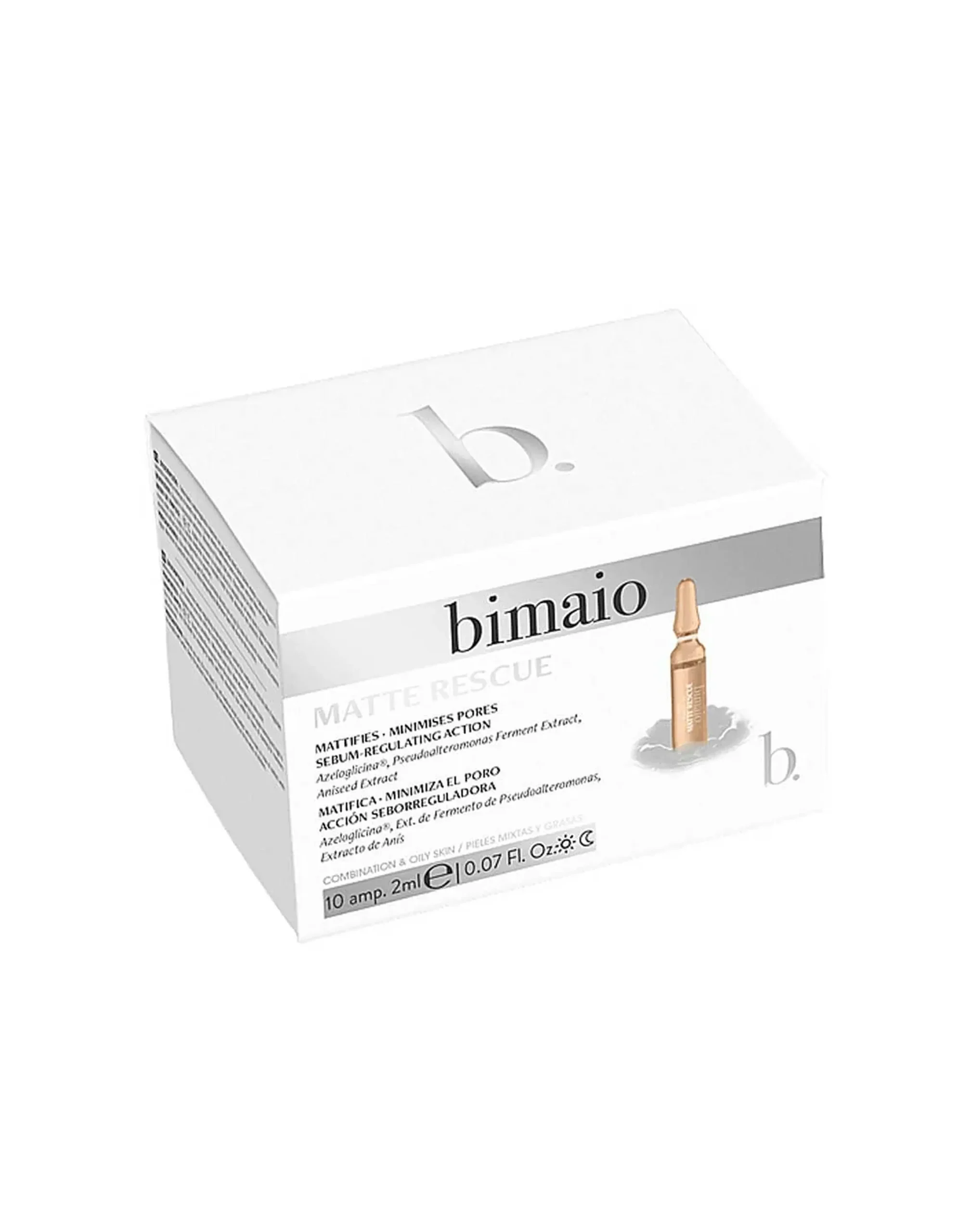 Para cuidar las pieles mixtas y grasas, los especialistas de Bimaio han creado las ampollas Matte Rescue. Contienen azeloglicina, que tiene una elevada actividad antimicrobiana, favorece la rápida renovación celular, reduce la aparición de post-acné y unifica el color de la piel. El producto también está enriquecido con antarktitina, que reduce la intensidad de la secreción sebácea y estrecha los poros dilatados. El extracto de anís tiene propiedades antiinflamatorias y cicatrizantes.